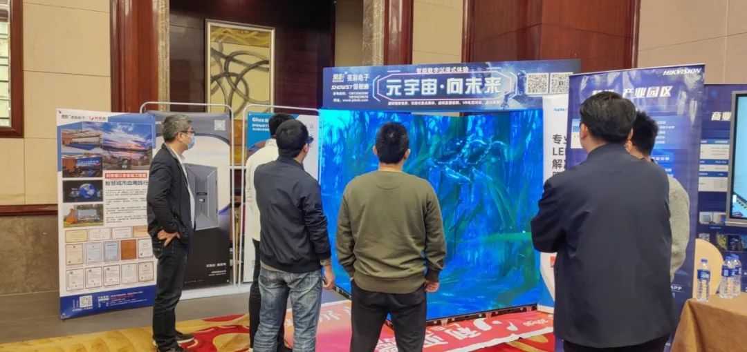 Jiangsu Liangcai exhibited the 3D LED "Metacosmic Theater" scene application scheme, which is built by GF box into a three-sided large screen. By covering the full view, create a virtual atmosphere, achieve immersive experience effect, let the guests linger.